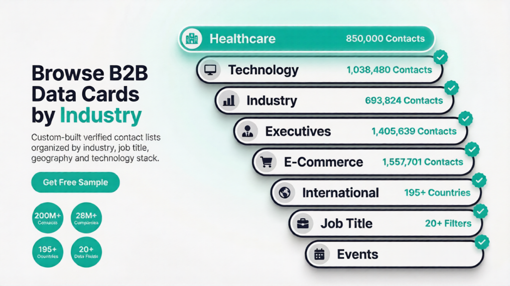 B2B data cards are segmented, verified contact lists organized by industry, job title, geography, company size, or technology. Each data card gives you access to decision-makers—ready for sales, marketing, or business development use.